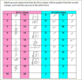 Her indices activity (extract below) is excellent. I expect that most people use this when teaching indices at A level or GCSE, but it also makes a helpful starter in a lesson on differentiating expressions with negative and fractions indices. Question 6 and 7 below often cause confusion for students - they want to write both as 2x-3.